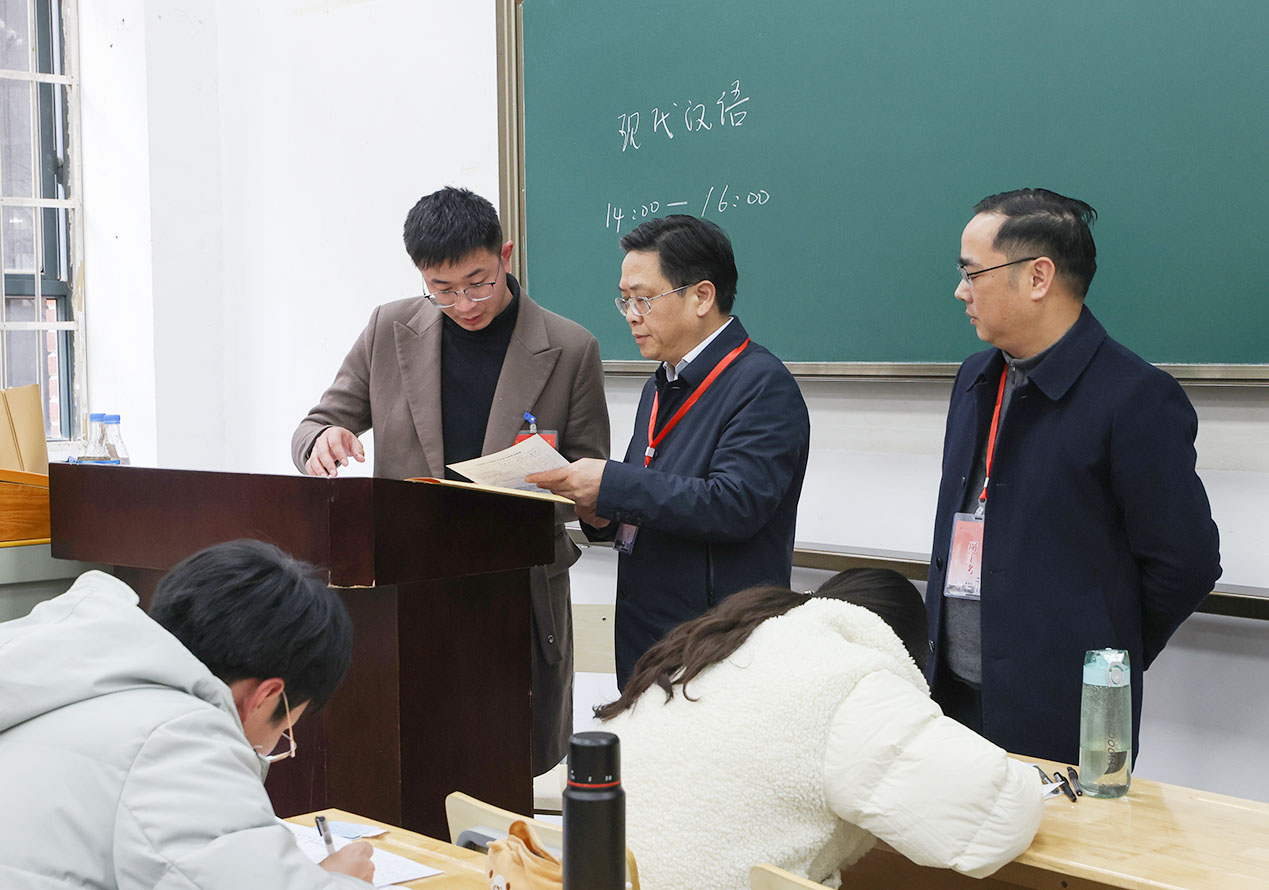 在3109教室,梅国平仔细询问监考老师考场情况,审阅公共选修课《现代汉语Ⅰ》试卷的难易程度、答题纸设计的规范等,要求进一步规范考试过程管理,做好试卷分析等试卷批改工作。