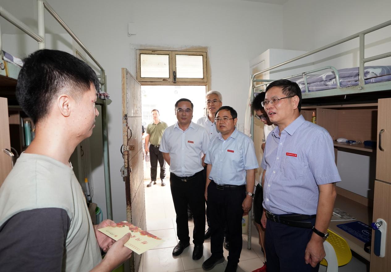 9月9日、10日,是我校2023级6387名本科生、3111名研究生报到的日子。9月10日下午,校领导黄加文、陈芬儿、汪洋、涂宗财、董圣鸿、钟业喜,分两路深入学生宿舍,看望慰问2023级本科、研究生新生,送上慰问金。党(校)办、学工部、研工部、教务处、资产与后勤保障处、资产经营公司等部门和相关学院一同参加。