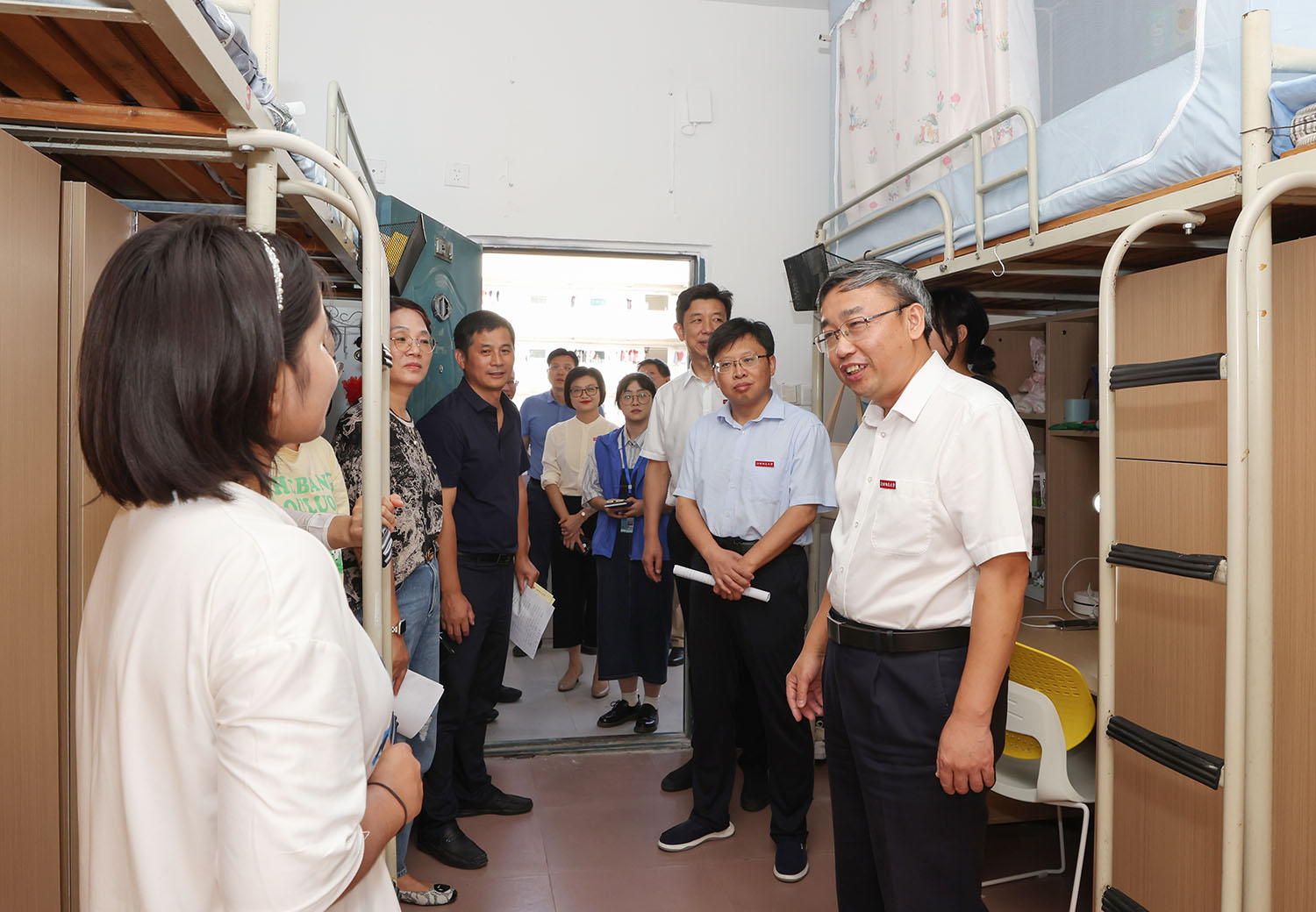 黄加文、汪洋、董圣鸿走访7、8、9栋的新生,看望公费师范生院新生黄雨霏,少数民族学生伊帕尔古丽·阿卜杜艾尼,心理学院硕士新生王彬宇等。“把孩子送到这里你们放心”,在走访7栋时,黄加文遇到历史文化与旅游学院的四位家长,与家长亲切交谈。校领导详细了解新生入校的生活状态,耐心倾听他们的反馈,多次叮嘱大家要互相帮助,注重寝室文化建设,有困难及时向老师寻求帮助;同时勉励大家珍惜在校时光,充分利用好学校的各类资源,全身心投入学习,度过愉快的大学生活。