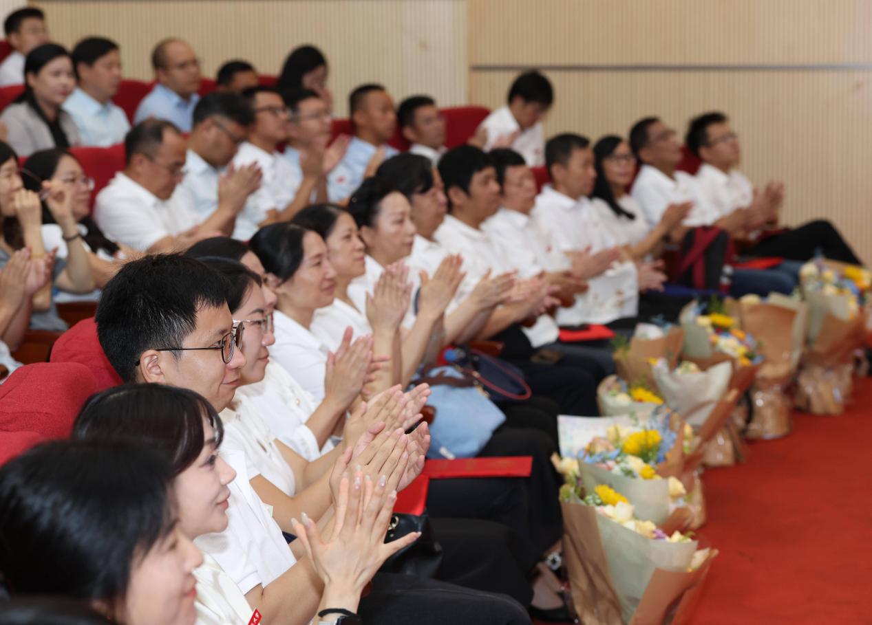 校党委书记朱小理代表学校向受到表彰的先进集体和个人表示热烈的祝贺,向全体教职员工和离退休老同志致以节日的问候,向新入职教师表示欢迎。他指出,全校上下要利用教师节契机,进一步深入学习贯彻好习近平总书记关于教育的重要论述和关于教师工作的重要指示批示精神,进一步弘扬尊师重教的风尚,持续完善教师发展保障机制,始终在思想上重视教师、在事业上支持教师、在生活中关怀教师,积极营造安心从教、热心从教、舒心从教、静心从教的良好生态。全校教职员工要自觉践行教育家精神,主动融入教育强国建设的伟大实践,积极投身学校改革发展大局,在各自岗位上精心育人、潜心科研、用心服务,努力实现个人成长与学校发展同频共振、双向奔赴。他强调,学校将持续优化内部治理体系,努力打造更加包容、支持、开放的办学环境,让每一位教师都能心无旁骛投身教学科研,施展才华、实现价值,凝聚起冲击“双一流”建设的强大合力,携手共创学校高质量发展新篇章。