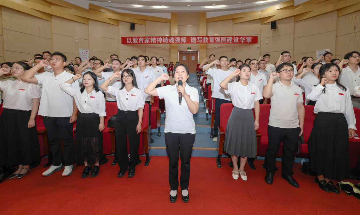 “我志愿成为一名人民教师,忠诚党的教育事业,遵守教育法律法规,履行教书育人职责,引领学生健康成长,做到有理想信念、有道德情操、有扎实学识、有仁爱之心,为教育发展、国家繁荣和民族振兴努力奋斗!”从教30年教师代表、数学与统计学院邓文丽老师带领新进教师进行宣誓。
