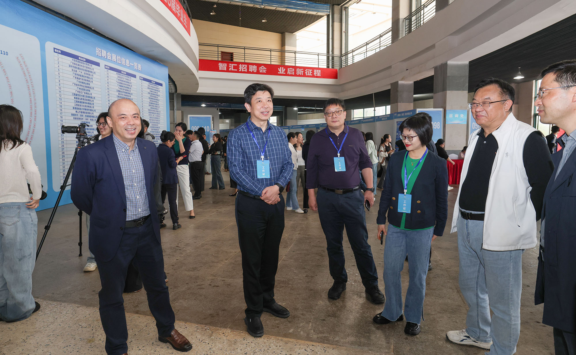 4月11日上午,董圣鸿陪同陈国江、黄远新等校友到在瑶湖校区图文信息中心举办的2026年校友企业专场招聘会暨校友企业风采展现场观摩、指导。